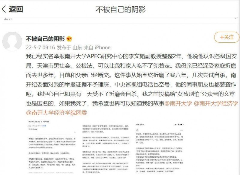 5月7日,微博用戶“@不被自己的陰影”發(fā)出一則長文稱,“已經(jīng)實名舉報南開大學APEC研究中心的李文韜副教授整整2年”。