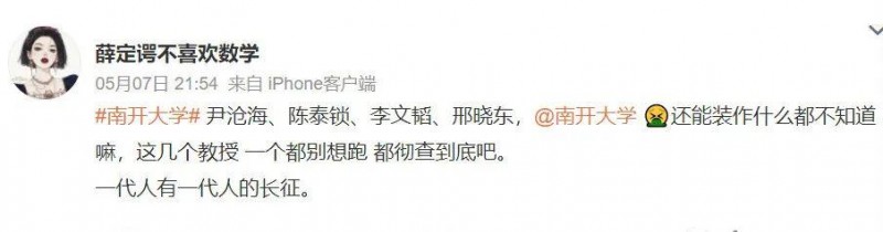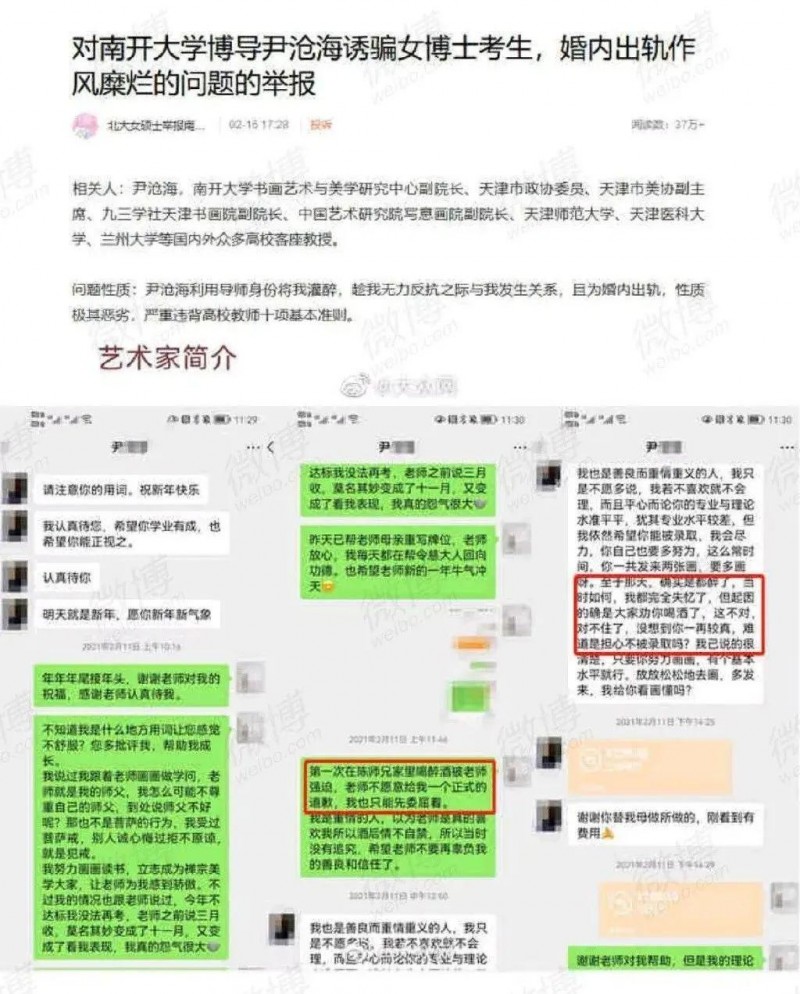 今年2月,微博用戶“@北大女碩士舉報南開博導尹滄海”發(fā)文舉報,南開大學博士生導師尹滄海誘騙女博士考生,婚內(nèi)出軌作風糜爛。