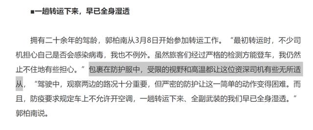 擁有二十余年的駕齡,郭柏南從3月8日開始參加轉運工作。“最初轉運時,不少司機擔心自己是否會感染病毒,我也不例外。雖然旅客們經過嚴格的檢測方能登車,我仍然止不住地有些擔心。”包裹在防護服中,受限的視野和高溫都讓這位資深司機有些無所適從,“駕駛中,觀察兩邊的路況十分重要,但嚴密的防護讓這一簡單的動作變得困難。而且,防疫要求規定車上不允許開空調,一趟轉運下來、全副武裝的我們早已全身濕透。”郭柏南說。