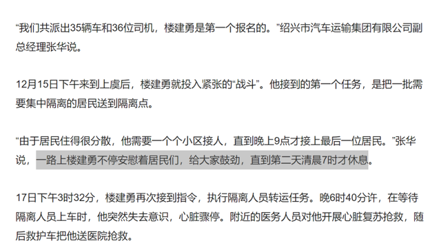 20211217日,浙江諸暨大巴司機樓建勇執行隔離人員轉運任務中離世。頭一天他一直工作到凌晨7點,第二天下午再次執行任務,在等待隔離人員時心臟驟停。樓建勇司機去世很不幸,但如果他是在開轉運大巴的路上去世,那將會更加不幸。