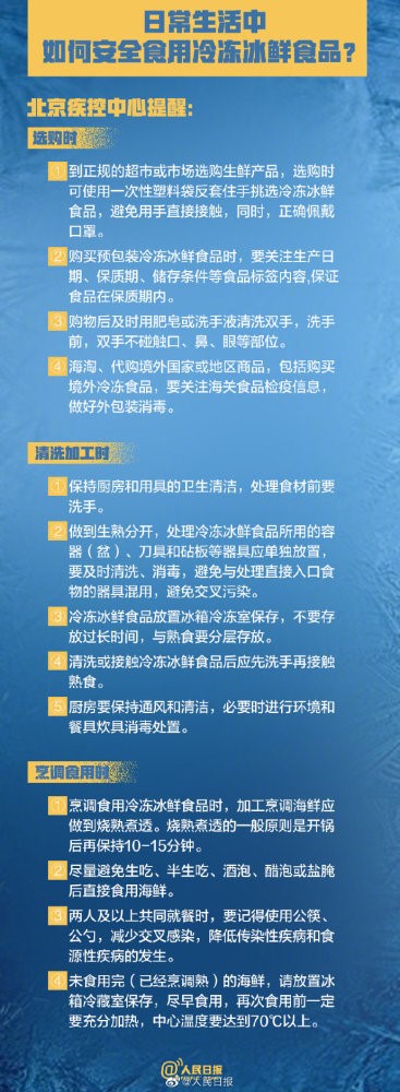 北京市疾病預防控制中心針對如何安全選購、食用冷凍冰鮮食品提出了三方面的建議: