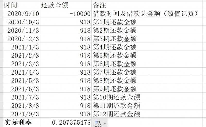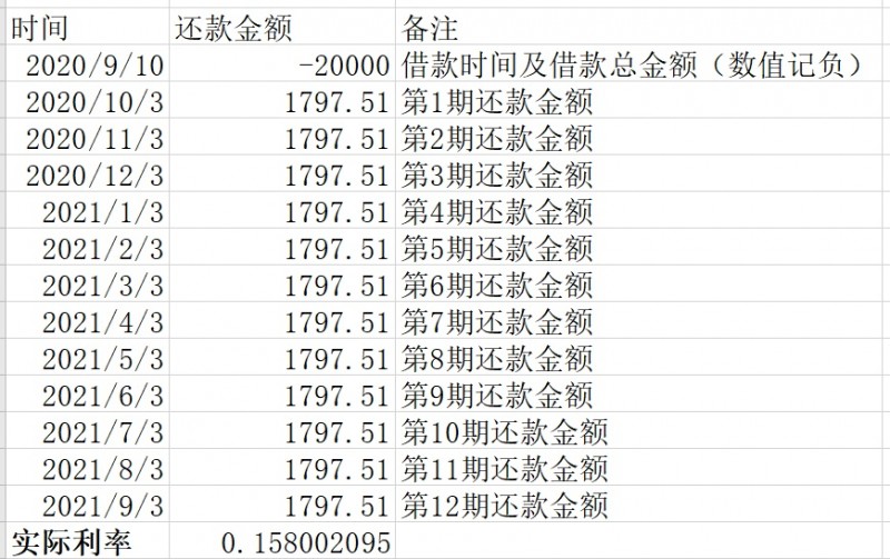 左邊一列,輸入還款日期;右邊一列,在開始借款日期一行,輸入借款總額(負(fù)值),在下面的空白行輸入每期還款金額(正值),最終可以得到結(jié)果(每期還款額取自軟件顯示需還款金額):