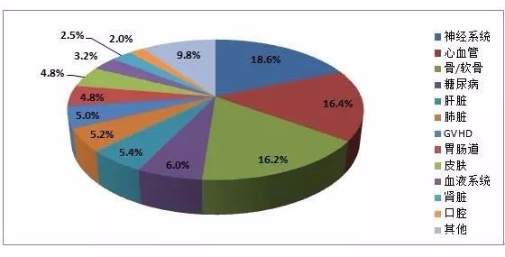 從治療的疾病種類來看,間充質干細胞的臨床研究涉及上百種疾病(表3)。將這些疾病按照器官系統分類,可以發現神經系統、心血管和骨科疾病是三類主要的研究領域,占比都在15%以上,總和超過一半。另外,糖尿病、肝臟、肺臟、胃腸道、皮膚和移植物抗宿主病(GVHD)的比例都在5%左右,是間充質干細胞重要的臨床研究方向。