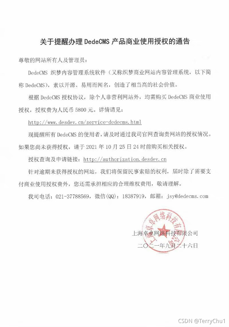 9月26日,dedecms(織夢)發(fā)布公告:除個人非盈利網(wǎng)站外,所有商用的個人、企業(yè),均需要購買DedeCMS商業(yè)使用授權(quán),授權(quán)費為5800元。“針對逾期(2021年10月25日24時)未獲得授權(quán)的網(wǎng)站,我們將保留民事索賠權(quán)利,屆時除了需需要支付商業(yè)使用授權(quán)費外,您還需承擔(dān)相應(yīng)的合理維權(quán)費用。”在經(jīng)歷了一年多的版權(quán)之爭后,織夢終于也收費了。