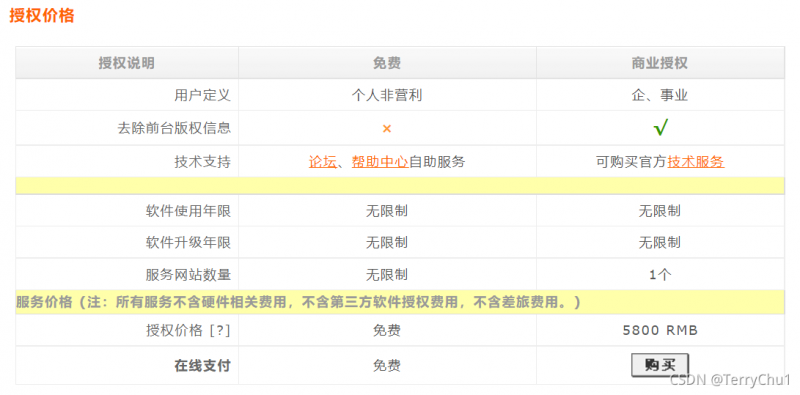織夢在其官網(wǎng)上公布了收費明細(xì),商業(yè)授權(quán)5800元,織夢強調(diào),除『個人非營利網(wǎng)站』外,其他網(wǎng)站需購買 DedeCMS 使用授權(quán),例如:政府單位、教育機構(gòu)、協(xié)會團體、企業(yè)、以營利為目的的站點,并且僅能使用一個網(wǎng)站。獲得授權(quán)的站點,在同一大版本范圍內(nèi)享受免費升級。如需升級到同一大版本范圍內(nèi)的不同級別授權(quán),按最新官方授權(quán)報價補足差價即可。