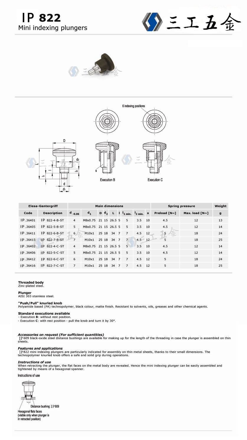 “三工五金專業生產IP822迷你型旋鈕柱塞”參數說明