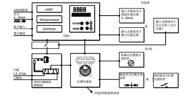 帶有后置氣動放大器的I/P模塊用來控制氣動執(zhí)行機(jī)構(gòu)。I/P模塊通過調(diào)節(jié)三位三通閥將從CPU發(fā)出的定位電信號按比例轉(zhuǎn)換為氣動信號。執(zhí)行機(jī)構(gòu)增壓或減壓的調(diào)整是連續(xù)的,因此可以達(dá)到極好的控制效果。當(dāng)?shù)竭_(dá)設(shè)定點(diǎn)時,三位三通閥鎖定在中間位置,將耗氣量減到小。總共有四種不同的氣動輸出:單作用和雙作用,各有“故障-安全”和“故障-閉鎖”兩種型號可供選擇。
