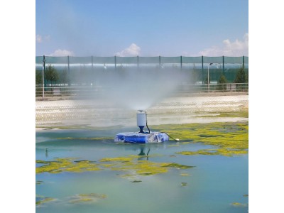 蒸發塘噴霧機(蒸發塘霧化器),電動機通過支撐柱安裝在浮臺上,電動機的動力輸出軸上設置有扇片,增壓水泵固定在浮臺下方,電動機外壁上固定有噴水裝置,增壓水泵通過水管與噴水裝置相連通,噴水裝置的出水口位于扇片的下方。